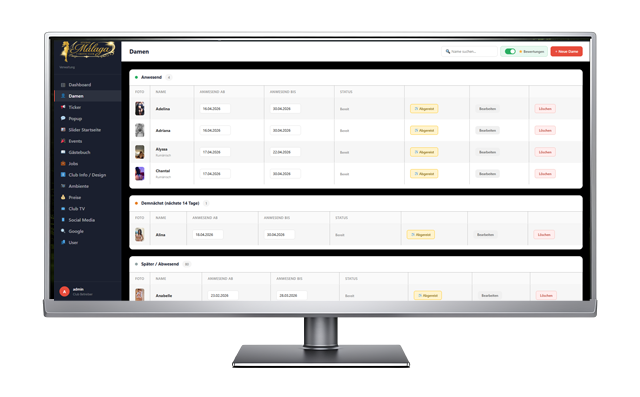 Anwesende Damen automatisch auf dem TV im Club anzeigen. Werbung schaltbar.